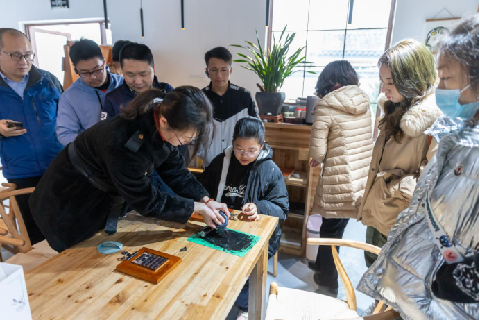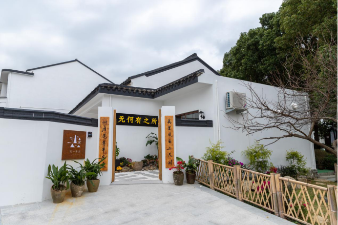 元一书房是路下徐村的特色书房,“无何有之所”其实就是什么都没有的地方,后门门匾上用的是樗舍,樗是树名,是一种无用之木,所以它可以存活很久,正好与前门相对应有“有无相生”的意境。进入书房,纯原木家装温馨又浪漫,同学们体验了古法造纸、活字印刷、扎染等文创项目,感受到了对中华文化传承的使命感与责任感。