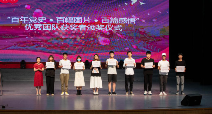 活动的最后一个环节是对入选“百年党史 .百幅图片.百篇感悟”的团队作品进行展示并对”入选奖“作品颁奖。此活动主要通过前期在全校大一、大二学生中将征集到的团队作品进行层层遴选,最终100幅左右的作品获入选奖。