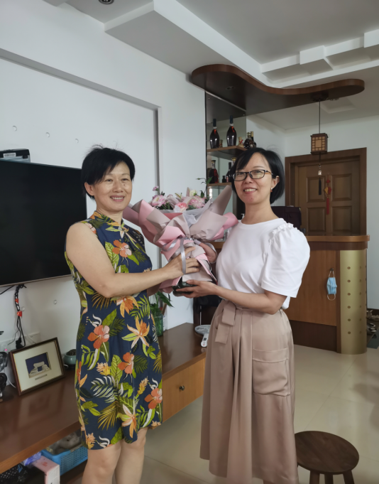 走入高建平、胡素清老师家,作为新教师代表的任杭璐老师、总支委员杨菊平老师分别向高老师、胡老师赠送了鲜花,贝院长向两位老师首先表达了感恩之情,汇报了马院近几年的主要变化、获得的教学科研成果、“十四五”规划的情况,并恳请两位教师一如既往地为学院的发展和学院“十四五”规划多提建议。作为有着30年以上教龄的高教授、胡教授回忆了为师生涯,并对年轻教师寄予了厚望,并对学院的更好发展充满了信心。