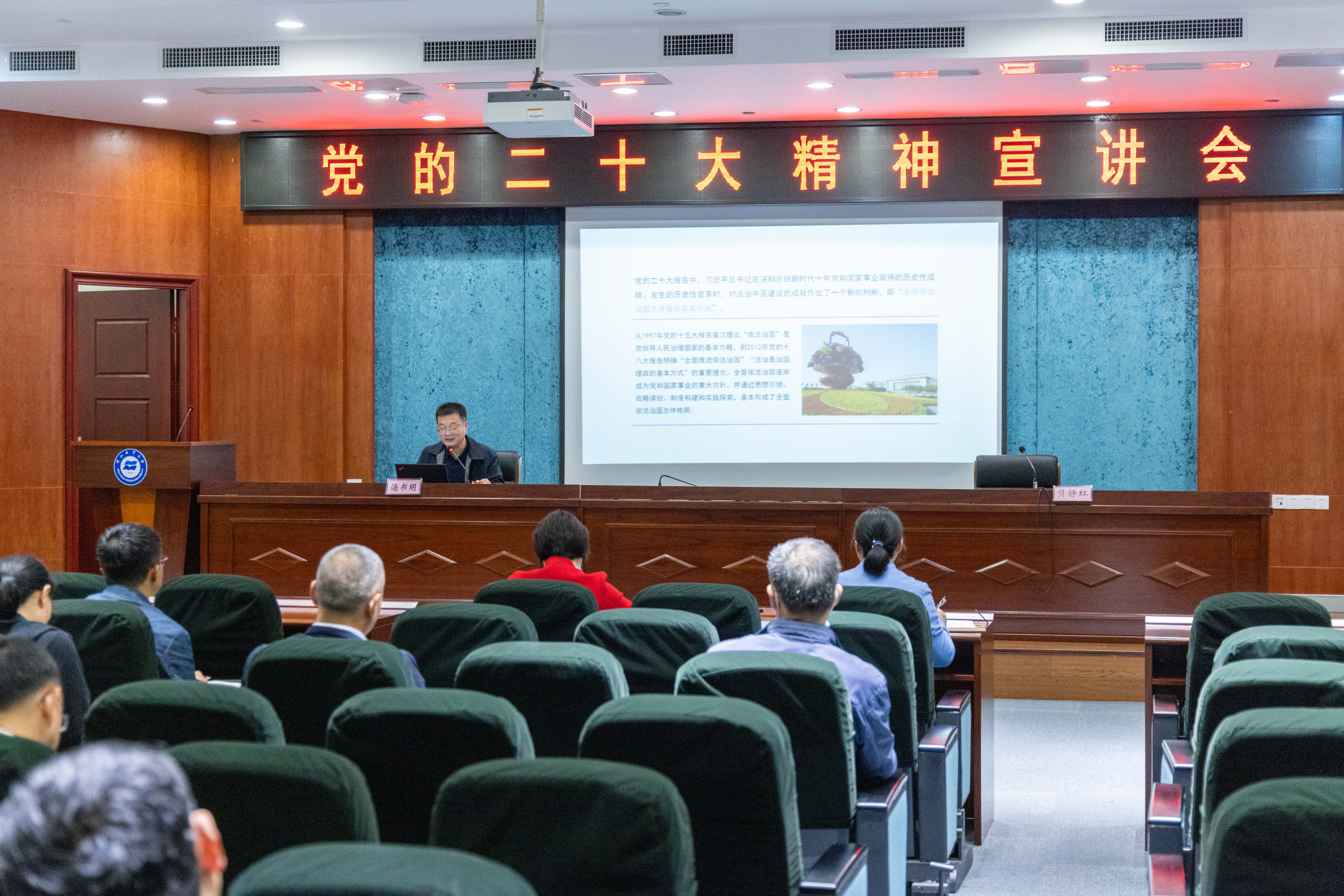 全体教师作《在法治轨道上全面建设社会主义现代化国家》专题报告。学院党总支书记、院长贝静红主持本次报告会。
