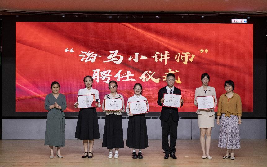 在比赛现场聘任获特等奖、一等奖的选手为“海马小讲师”,并为他们颁发聘书。