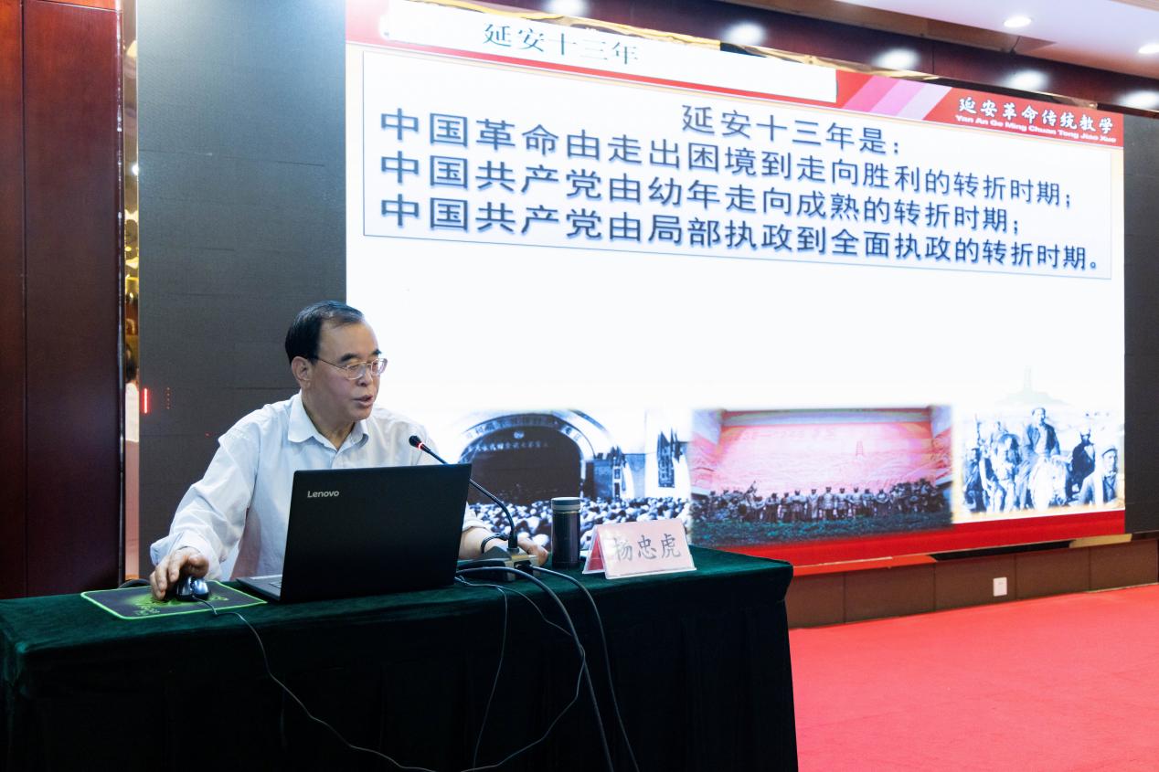 开班仪式结束后,中国延安干部学院的杨忠虎教授给学员们讲授党史讲堂——“党中央在延安十三年”。杨教授从毛泽东、习仲勋对陕北“两点一存”的评价切入,将党中央在延安的历史划分为落脚陕北、延安岁月、转战陕北三个阶段,并深入梳理了延安十三年的历史脉络,并在回望历史中提炼出四点精神启示:一是坚定的理想信念,二是解放思想、实事求是,三是全心全意为人民服务,四是艰苦奋斗的精神。