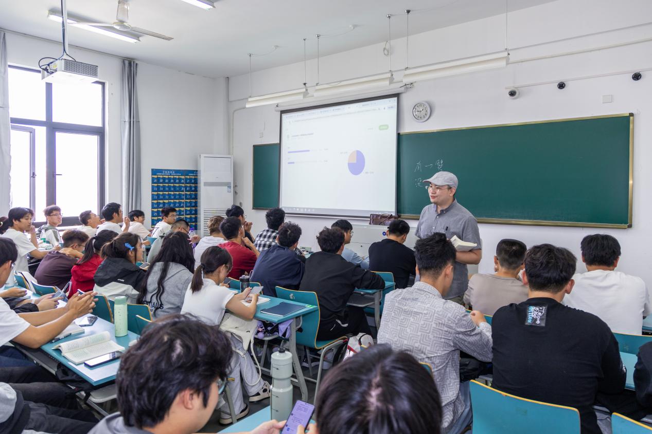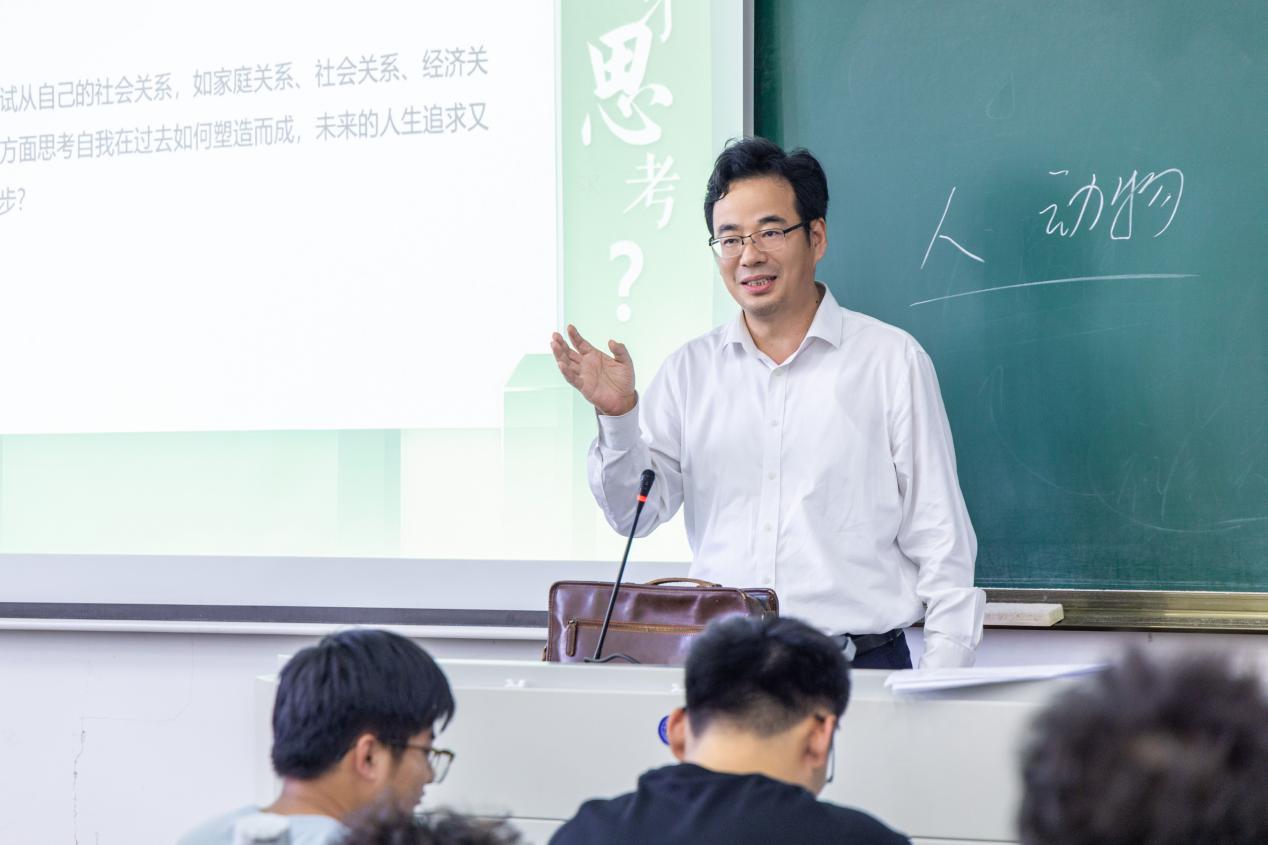 课堂上,侯沐晗老师正在跟A24养殖1 、2班同学讲授《正确认识人的本质》。他从问题出发导入课程,引导学生尝试回答“人仅仅是动物吗?什么决定了人之所以为人?”。再将学生的回答分类归纳,层层设问,推动学生对既有回答积极反思,从现象深入到本质,从自然属性深入到社会属性,从抽象存在物深入到具体的劳动实践,进而理解马克思主义关于人的本质认识的根本性与正确性,并以此为基础,理解过往人生从何而来,未来人生又将从何出发。