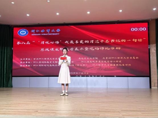 结合课程实际,推动课程教学改革形成的“十百千万”实践教学品牌,每学期在本科生一、二年级近万名学生中结合五门思政课程教学内容。本次活动以“礼赞祖国青年说”为主题,结合新中国成立75周年以来,特别是党的十八大以来取得的伟大成就和生动实践,学生以团队为单位,从红色资源、绿水青山、海洋强国、青年担当等元素出发,以多形式呈现学习感悟,各任课教师在近千份作品中,经班内推荐、任课教师首选,各教研中心复评、学院审核的基础上,最终遴选出36支优秀团队入围比赛。比赛中,同学们以个人演讲、团队情景剧表演、微电影等方式讲好中国故事、浙江故事、海大故事,通过参与教学汇报深切感悟党的创新理论和实践伟力。经过激烈的角逐,B23历史2班潘舒婷团队、A24轮机3班胡相宜团队获特等奖,B23中文4班柴宇泽团队、A24经济1班官洹伊团队等7个团队获一等奖。