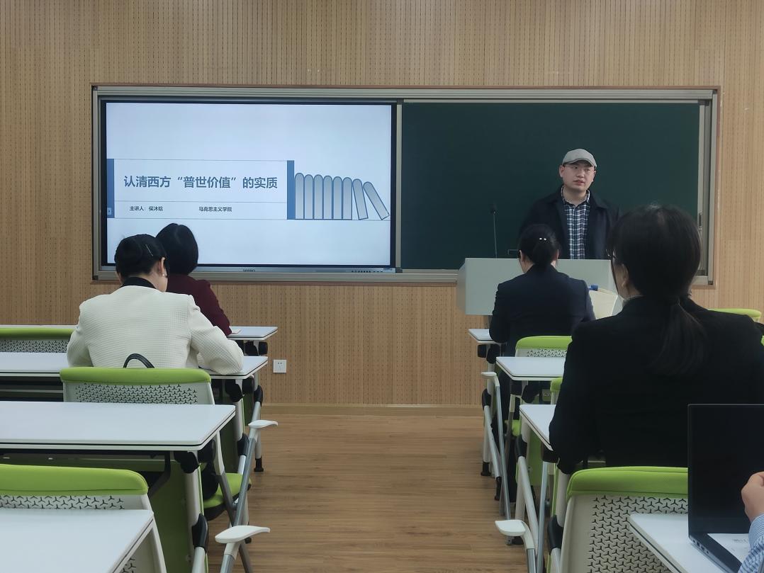 本次观摩课主讲教师为《思想道德与法治》教研中心青年教师侯沐晗,侯老师首先做了15分钟的授课演示,其授课主题为教材第四章第二节的内容。讲课中,侯老师用大量的案例阐述了构建全人类共同价值的科学性和重要意义。