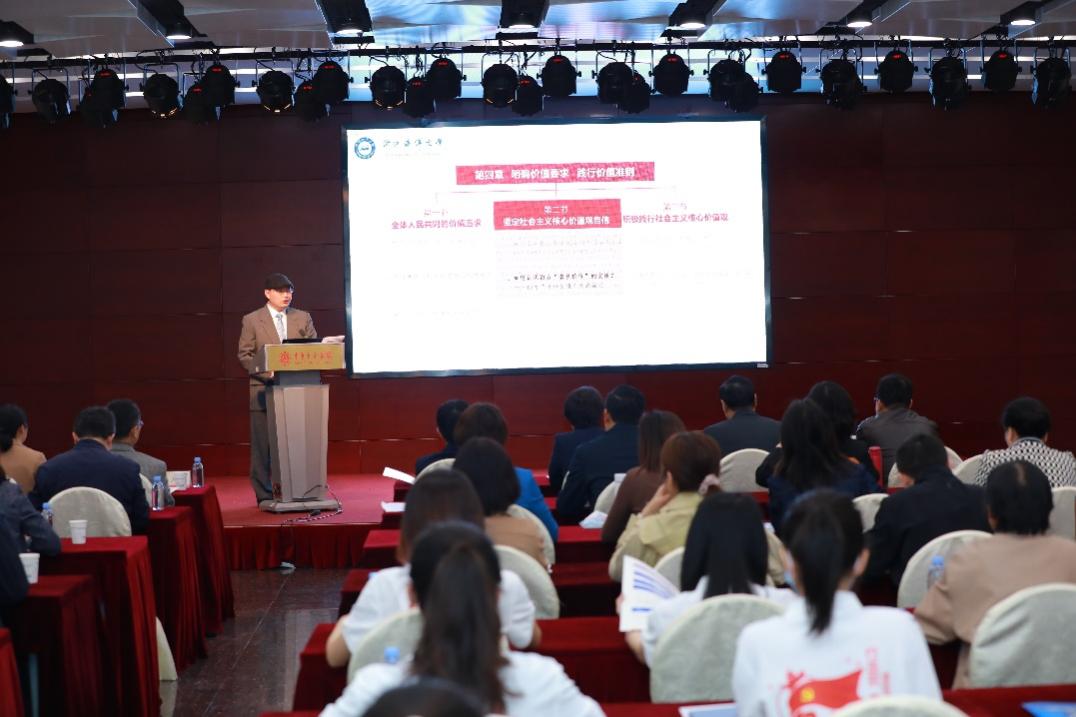 教授王仕民进行点评。贝静红指出,作为思政课教师,要坚持问题导向,坚持系统观念,牢记习近平总书记对思政课教师“政治要强、情怀要深、思维要新、视野要广、自律要严、人格要正”的要求,实现化理论为德性,化理论为方法,达到培根铸魂,启智润心的目标。