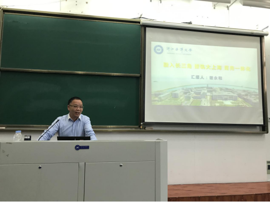 谢永和副校长首先深刻阐述了舟山应充分发挥区位与独特优势,加快建设七大园区,打造国际物流岛;详细介绍了鱼山绿色石化基地、波音737完工与交付中心、新奧舟山LNG接收站等重大项目背景及进展情况;提出在建设过程中要顶层设计,统筹发展生态优先,制度创新,内生动力。谢永和副校长强调,在推进融入长三角,接轨大上海,甬舟体化的进程中,要充分挖掘港口经济圈、浙江自由贸易试验区、宁波舟山港的潜力,建设好勇舟高铁、宁波舟山港主通道等。
