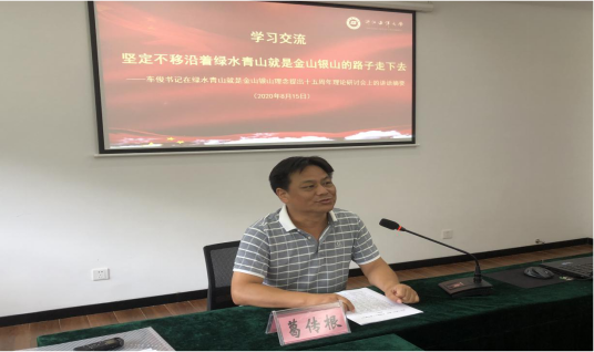 签约共建仪式后,全体教师一同学习了浙江省委书记车俊在2020年8月15日在绿水青山就是金山银山理念提出十五周年理论研讨会上的讲话《坚定不移沿着绿水青山就是金山银山的路子走下去》摘要,并围绕“坚定不移践行“两山”理念,我们为美丽乡村建设献策”展开学习交流。思修教研室葛传根博士作为代表 发言,结合“两山”理念的内涵和外延,葛博士提到舟山的海洋牧场、海洋岛屿也是绿水青山和金山银山,我们要保护海洋生态和环境,实现海洋经济可持续发展,使海洋成为舟山经济高质量发展的战略要地,在建设“重要窗口”中展现更大作为。