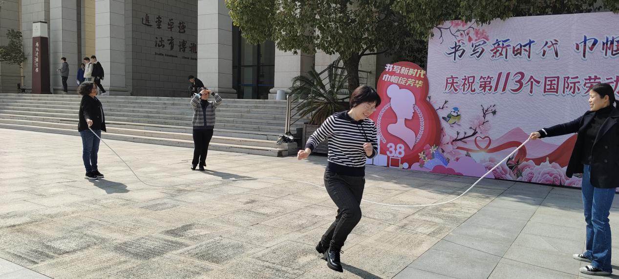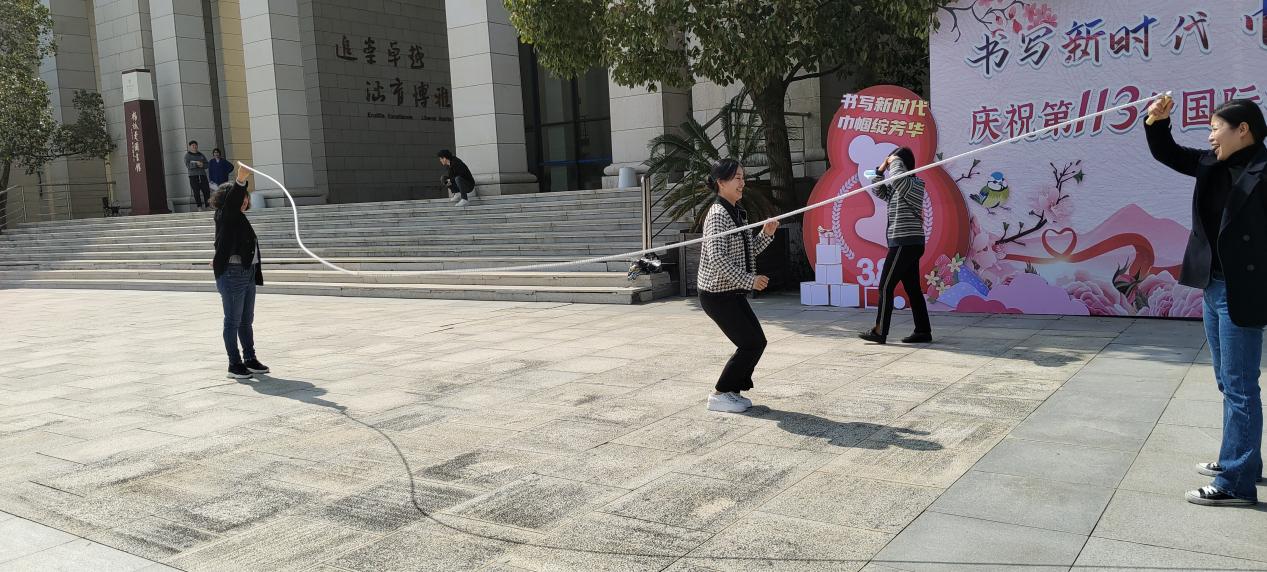 为全面贯彻落实党的二十大精神,更好的凝心聚力,团结带领女教职工以更加昂扬的斗志不断奋斗,开创事业发展新局面,同时也为丰富女教职工的文化生活,凝聚巾帼力量,展示巾帼风采,在第112个“三八”国际劳动妇女节到来之际,3月8日下午,马克思主义学院工会和妇联联合开展女教职工团建活动。团建活动包括跳长绳、踢毽子、摄影等友谊赛项目。